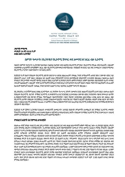 የኢፌዴሪ መንግሥት ኮሙኒኬሽን አገልግሎት የኢትዮጵያ የተሟላ የማክሮ ኢኮኖሚ ማሻሻያ ፕሮግራም በተለያዩ ዘርፎች ተጨባጭ እና ዘላቂ የእድገት ውጤቶችን በማስመዝገብ ለጠንካራ እና ተወዳዳሪ ኢኮኖሚ መሰረት ጥሏል፡፡ የመንግሥት ቁርጠኝነት በታየበት በዚህ የኢኮኖሚ ማሻሻያ ፕሮግራም ለዓመታት በኢኮኖሚው ላይ ተጋርጠው የነበሩ መዋቅራዊ ችግሮች ደረጃ በደረጃ እንዲቀንሱና ውስጣዊ ዐቅም ያለው፣ ከአለም ጋር የተሳሰረ እና በገበያ ተወዳዳሪ የሆነ ጠንካራ ኢኮኖሚ እንዲገነባ አስቻይ…