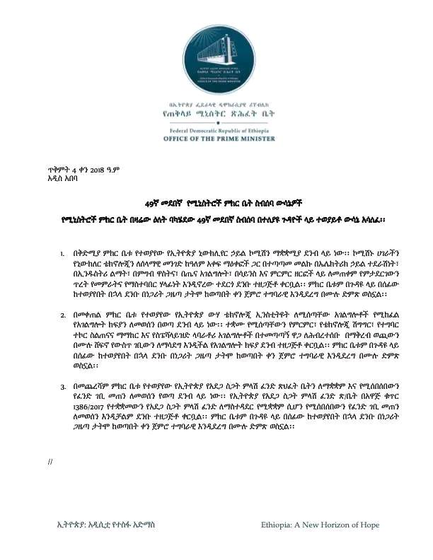 የሚኒስትሮች ምክር ቤት በዛሬው ዕለት ባካሄደው 49ኛ መደበኛ ስብሰባ በተለያዩ ጉዳዮች ላይ ተወያይቶ ውሳኔ አሳለፈ።