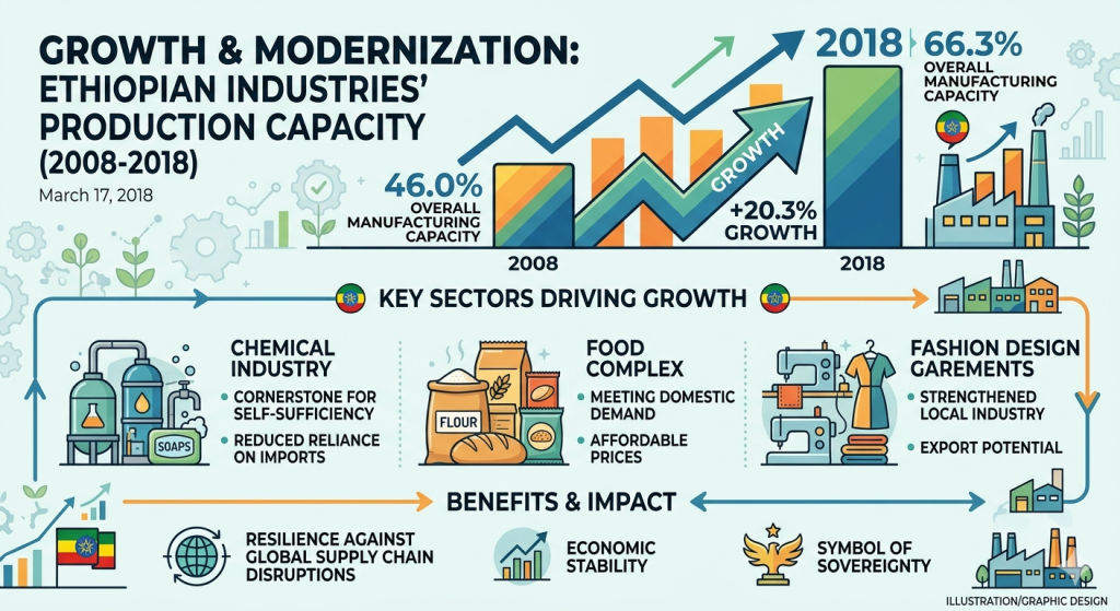 steady growth and modernization. The country’s overall manufacturing capacity had risen from 46 percent ten years ago to 66.3 percent, a strong progress that has reshaped Ethiopia’s production landscape. The chemical industry has been a cornerstone of this transformation. Producing sufficient goods in both quality and quantity is not only an economic milestone but a matter of national
